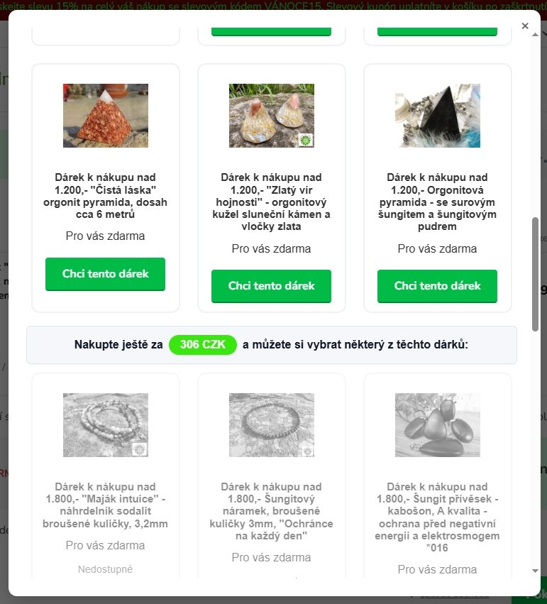 Položky, které jsou šedivé, nejsou dostupné pouze v případě, že je objednávka nižší než kategorie dárků.