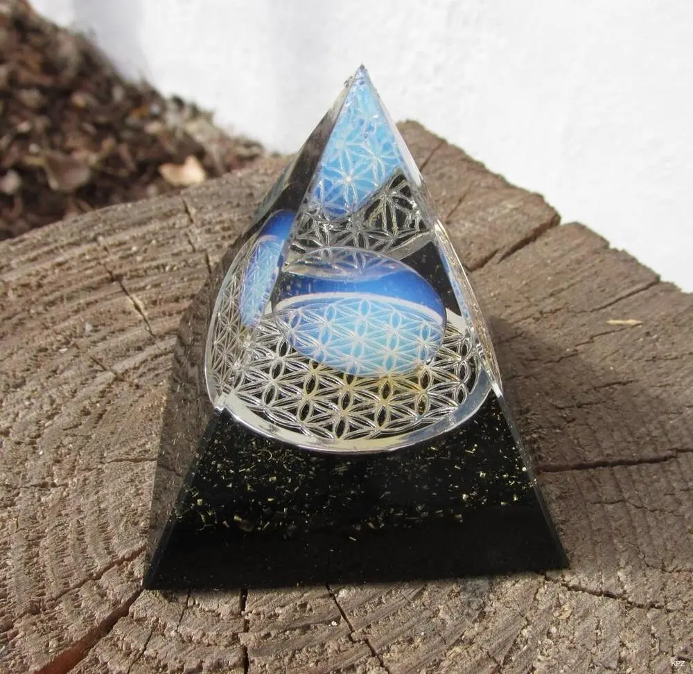 Orgonitová pyramidka tak úchvatná, že od ní nebudete moci odtrhnout oči. Kombinace opalitu - syntetiského měsíčního kamene, kovového květu života a šungitového pudru je tajemná, na první pohled tmavší, ale když se zadíváte pozorněji, uvidíte úchvatnou hru duhy a pocítíte silnou ochrannou energii, kterou tento orgonitek vyzařuje.