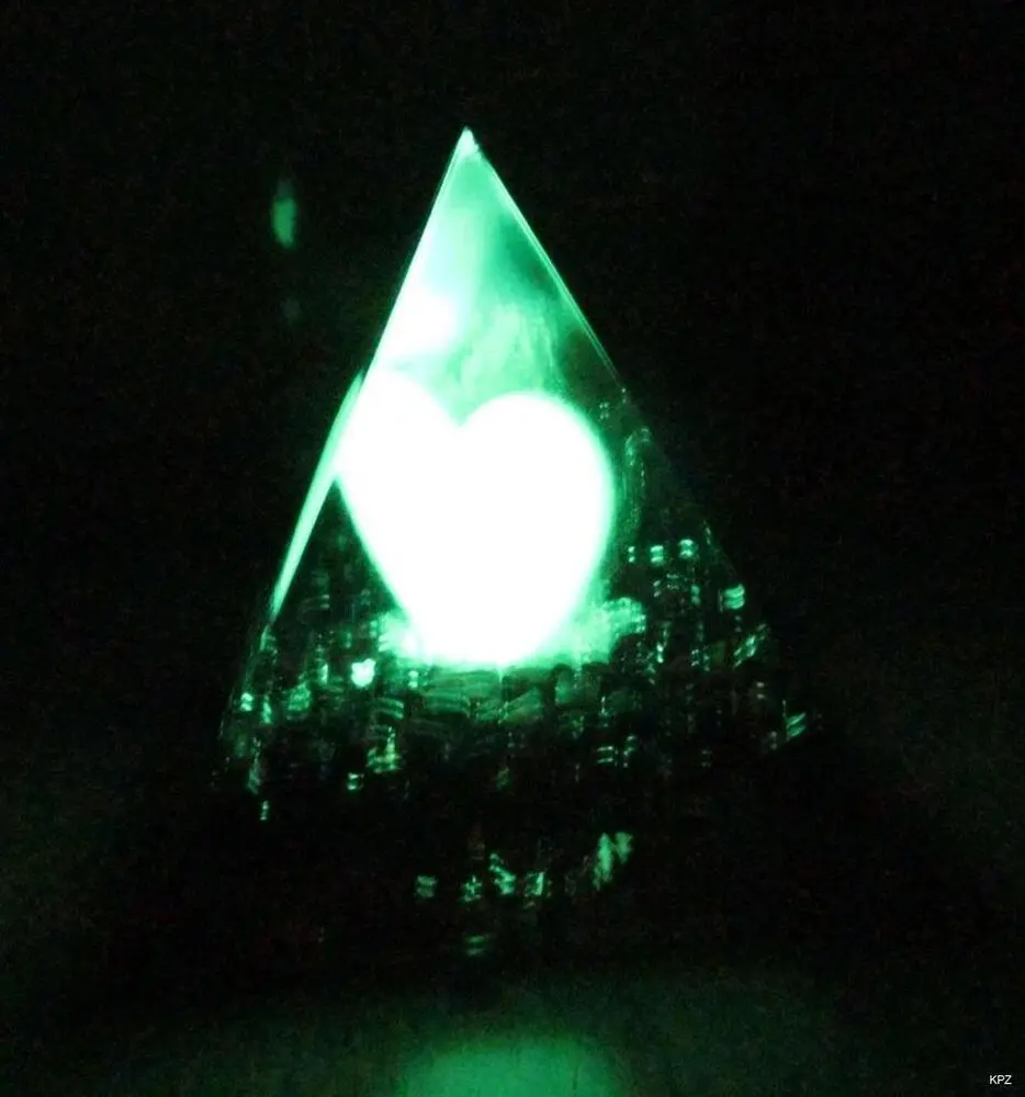 Pyramidka se svítícím srdíčkem, granátem a vločkami plátkové mědi. Vaše osobní světýlko pro lásku, podporu odvahy a vášeň.